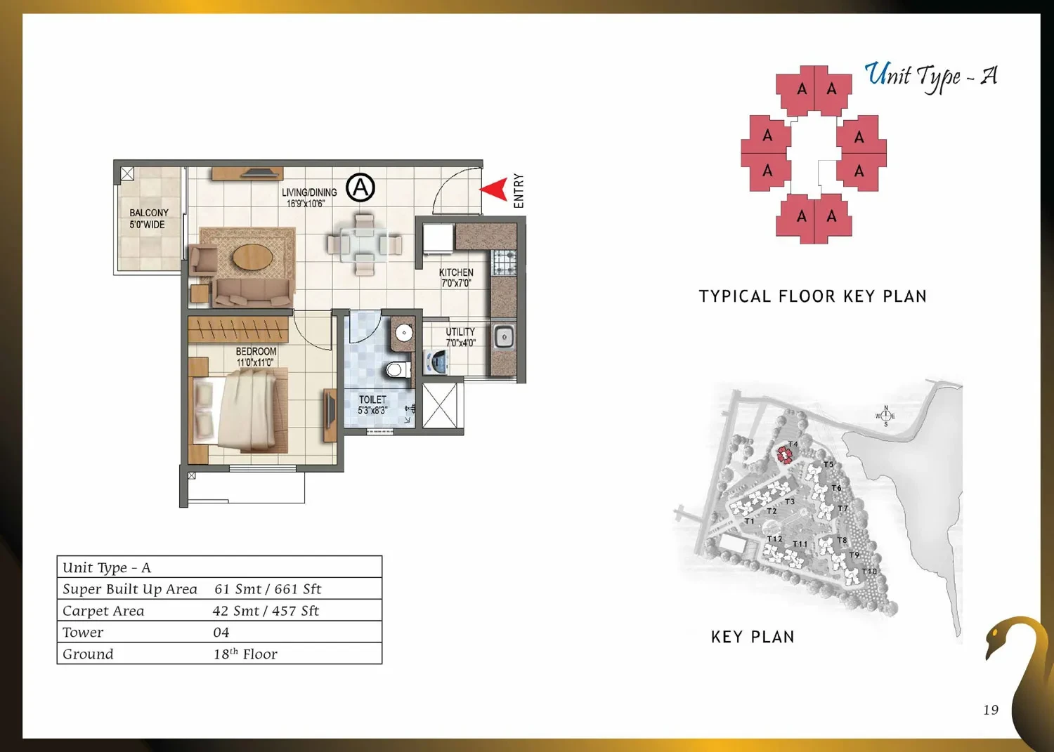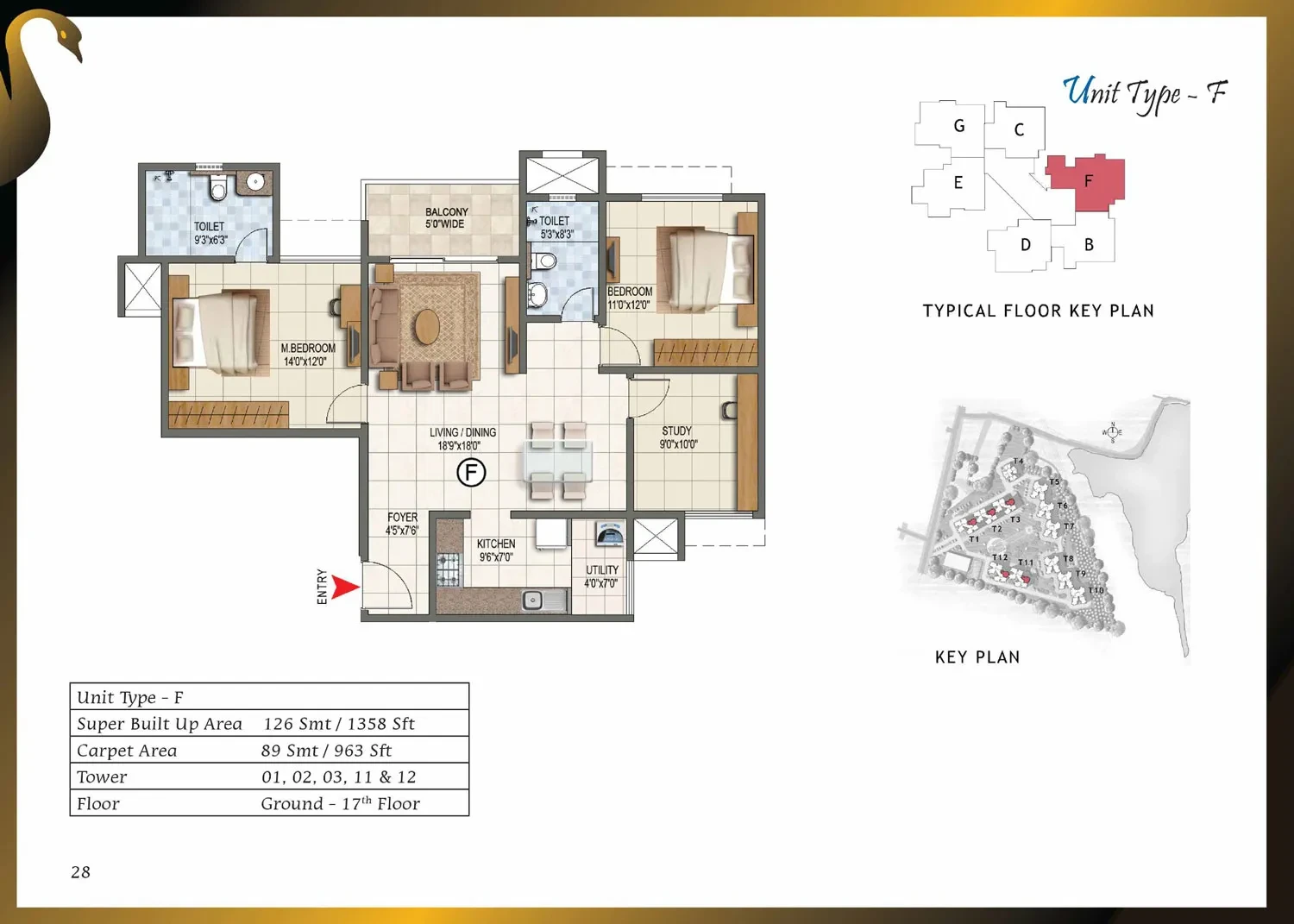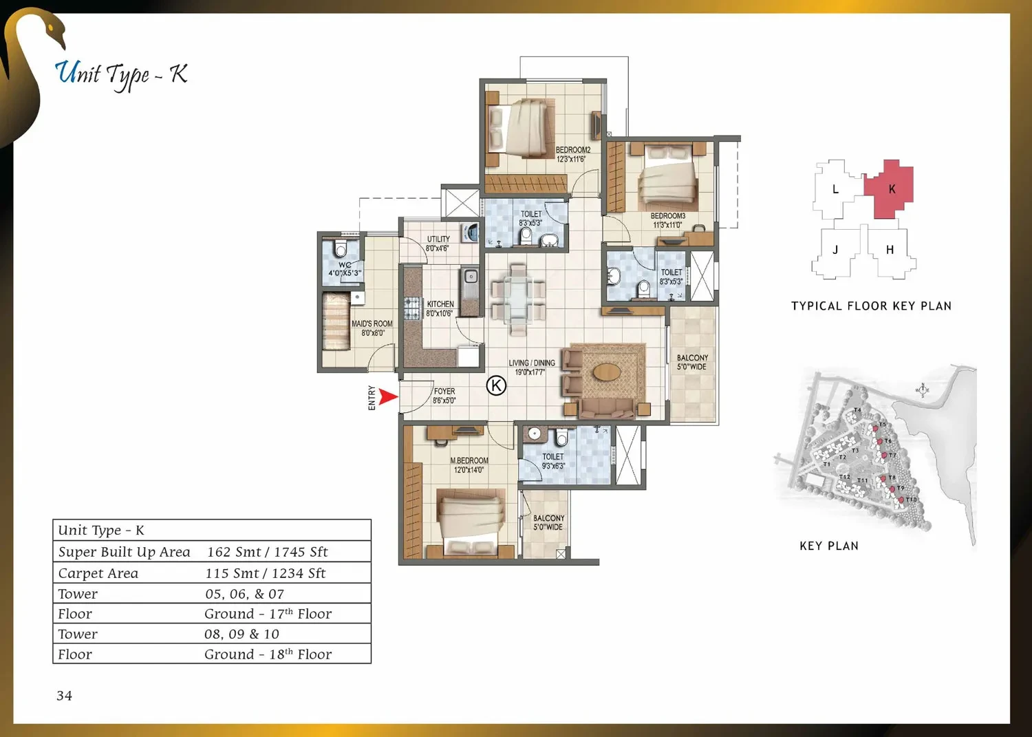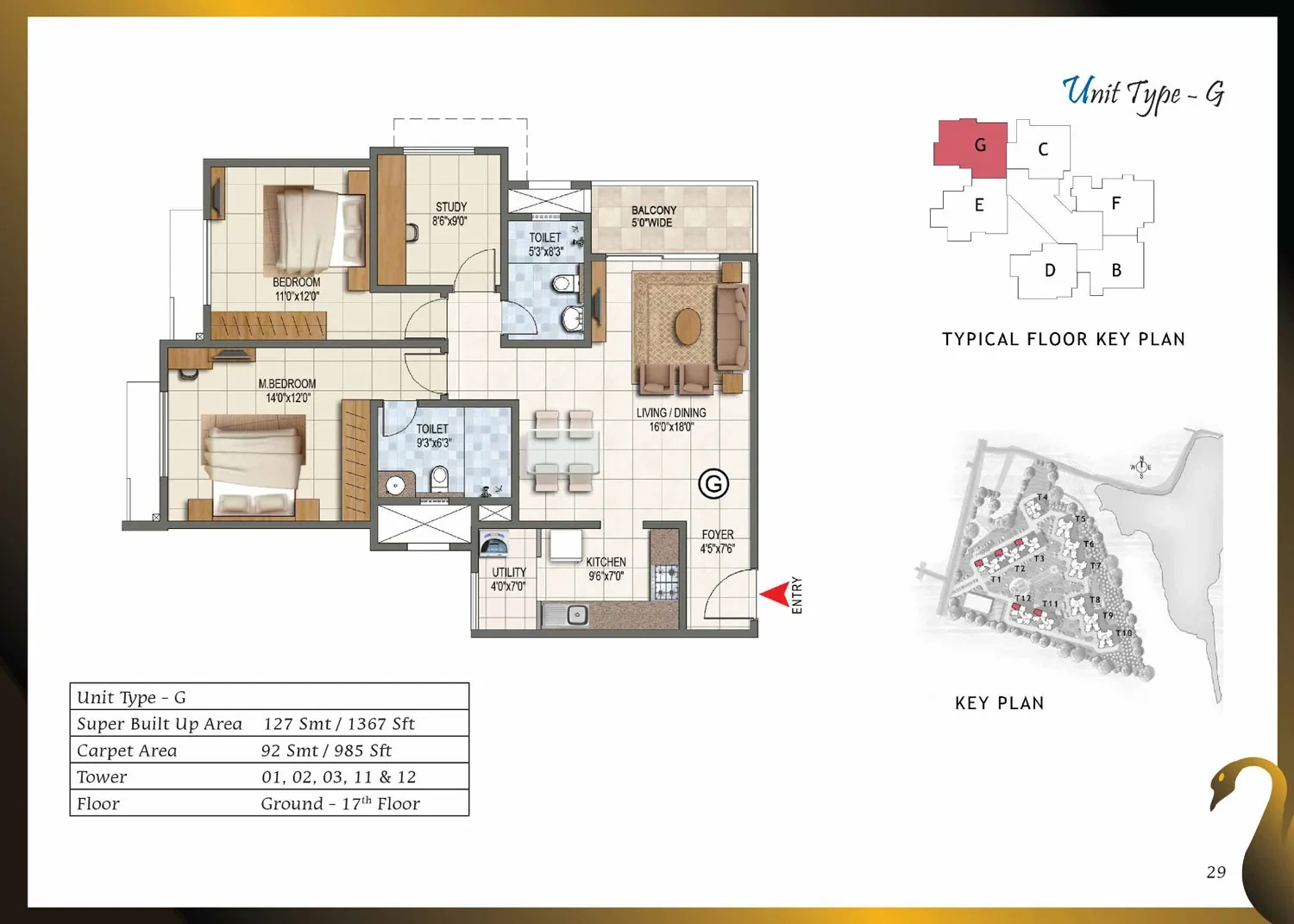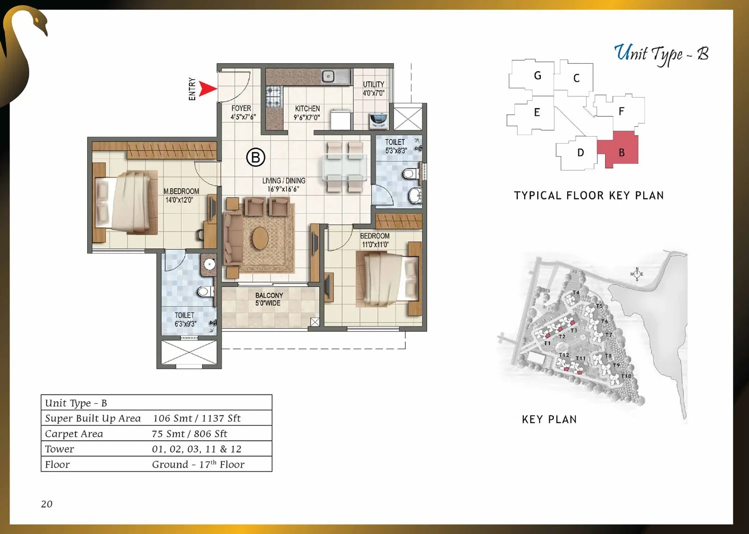 CategoryDetailsStructure & WallsRCC framed structure with cement blocks used for walls wherever required.Towers / Floors12 towers, each with Ground + Lower Ground + 17 or 18 upper floors.Unit Types & Sizes1, 2, 2.5 & 3-BHK units; sizes range approximately from 661 sq.ft to 1,750 sq.ft.Lobby / Common AreasGround-floor lobby in granite or marble; upper-floor lobby in vitrified tiles; lift cladding in granite/marble; lobby walls with texture paint and ceilings in distemper; staircases finished in Kota stone.Flooring (Apartments)Vitrified tiles in foyer, living, dining, corridors, and bedrooms; anti-skid ceramic tiles in balconies.Kitchen & UtilityGranite countertop with ceramic tile dado up to 2 ft above counter; stainless steel sink with chrome-plated taps; ceramic/vitrified flooring; provision for exhaust fan.Toilets / BathroomsAnti-skid ceramic tiles for flooring; wall tiles up to false ceiling; granite counter wash basin in master toilet; pedestal basins in others; wall-mounted EWCs; concealed piping; geyser provision.Doors & WindowsMain door with solid wood frame and polished flush shutter; internal doors with wooden frames and laminated shutters; UPVC/aluminium windows with sliding shutters and mosquito mesh provision.Electrical & PowerConcealed copper wiring with modular switches; adequate power points; provision for ACs in bedrooms; ELCB and individual meters; 100% power backup for common areas and apartments.Paint & FinishesExterior with textured paint; interiors in oil-bound distemper; enamel-painted railings.AmenitiesClubhouse, swimming pool, gym, jogging track, landscaped gardens, children’s play area, multipurpose hall, badminton, squash and tennis courts, CCTV surveillance, 24/7 power backup and security.
