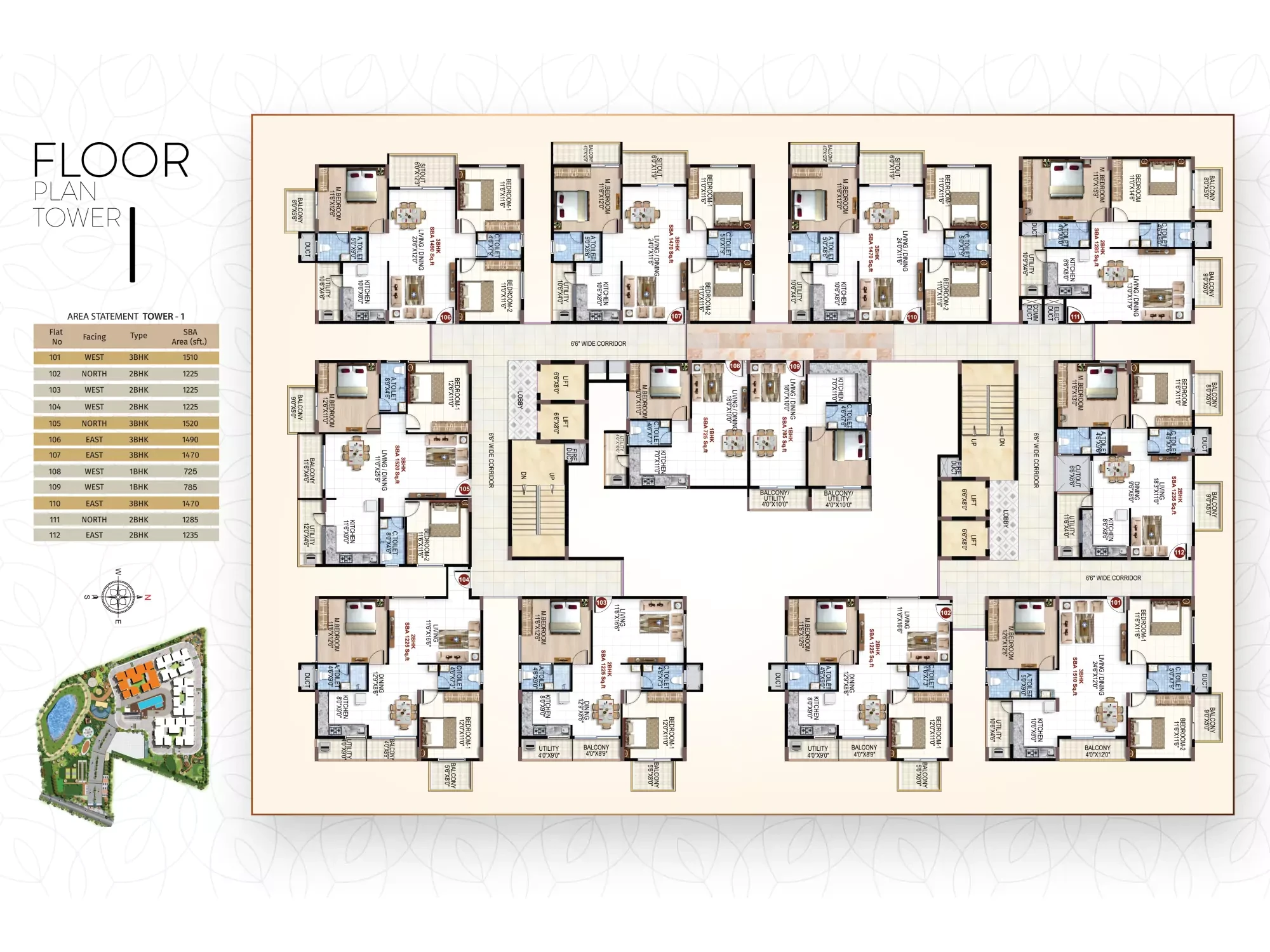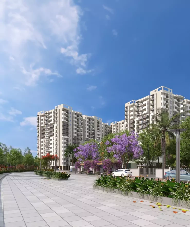 Configuration: 1, 2, and 3 BHK apartments across 4 high-rise towers (B+S+G+13 floors).