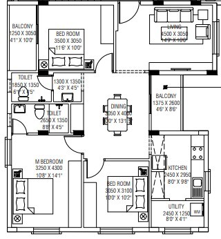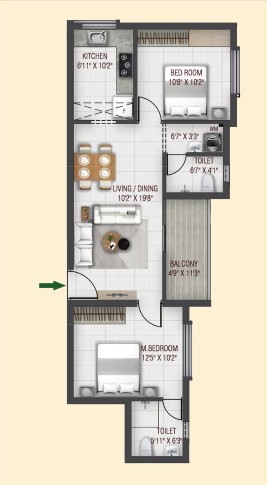 • 2’x2’ Branded vitrified tile for living, dining, bedrooms, kitchen & Balconies.