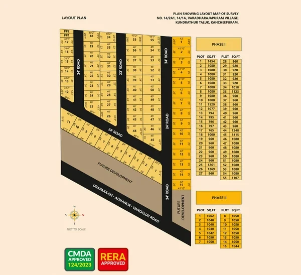 With plot sizes Phase I ranging from 765 sq.ft to 1529 sq.ft, Phase II ranging from 1040 sq.ft to 1062 sq.ft, you can choose the perfect size for your dream home. Located in Mannivakkam - Adhanur, only 15 minutes away from Tambaram, this project is conveniently located near prominent schools, colleges, hospitals, and industries.