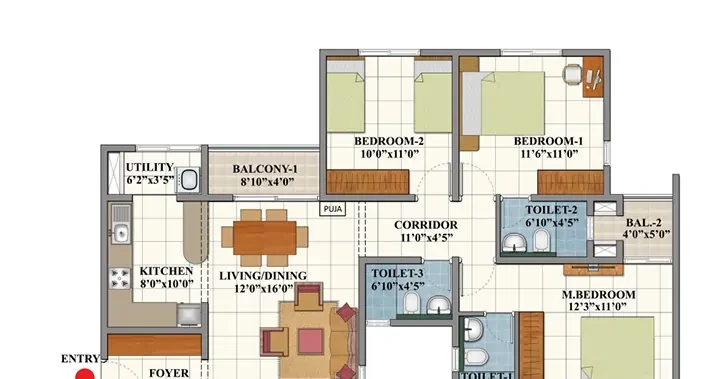 Foyer, living/dining area, kitchen with utility, master bedroom, additional bedrooms, toilets, balconies, and a dedicated puja (prayer) area.