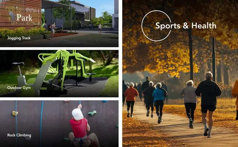 Unique Facilities: Includes specialized zones such as a pet-friendly park, senior citizen zone, rock climbing wall, and a skating rink