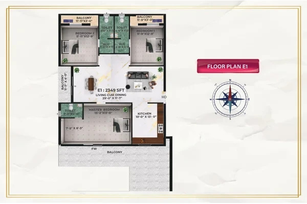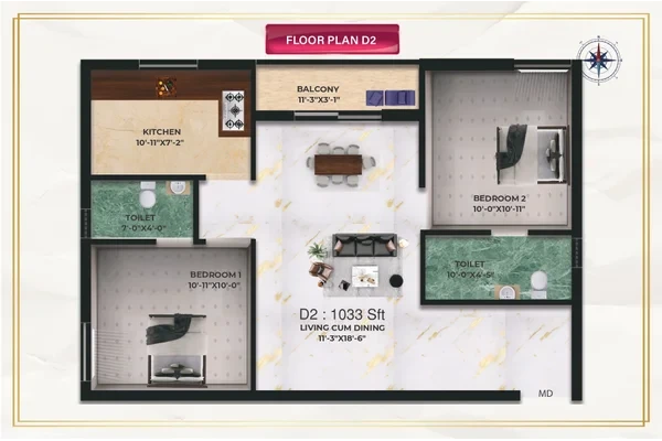 Living, dining ; bedrooms will be finished with 4'x 2' vitrified tiles with matching