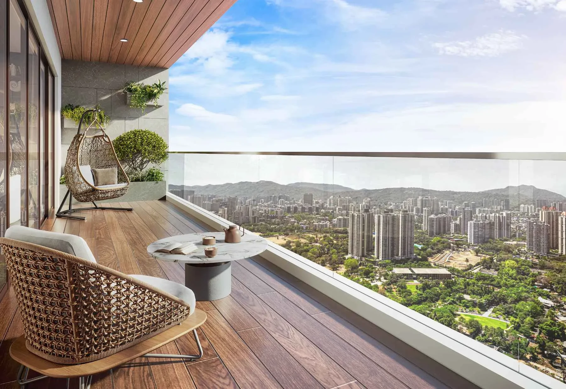 - Living/Dining: Spacious living room with an attached balcony, dining space with a view, and a kitchen opposite.