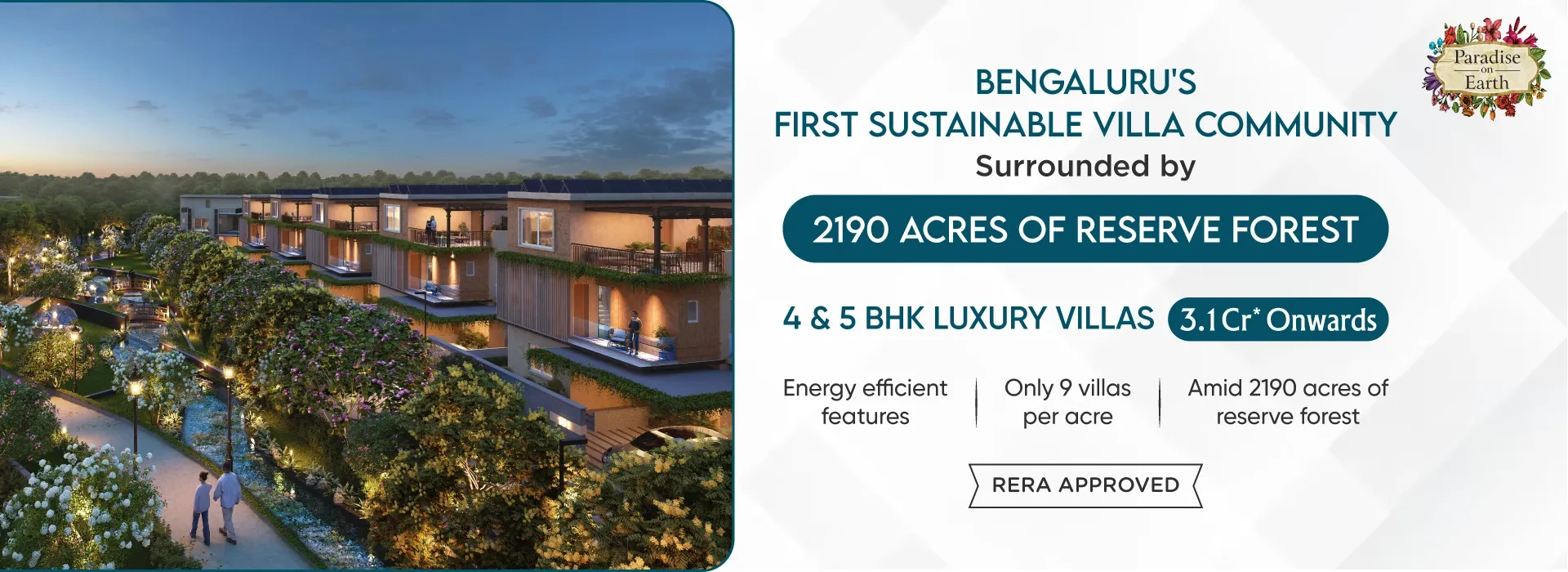 ‘Paradise on Earth’, located in Gangasandra, is surrounded by 2,190 acres of lush green reserve forests, right in the lap of nature. Paradise on Earth is Bengaluru’s first sustainable villa community. Spread across 24 acres of pristine land Paradise on Earth offers 219 tastefully designed villas. The density is just 9 villas per acre which ensures plenty of open spaces with well landscaped parks & plantations. Paradise on Earth has IGBC Platinum rating pre-certification.