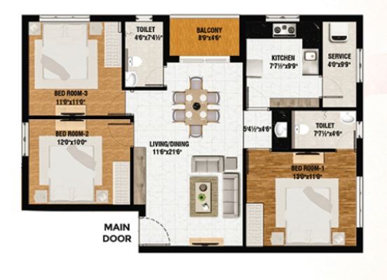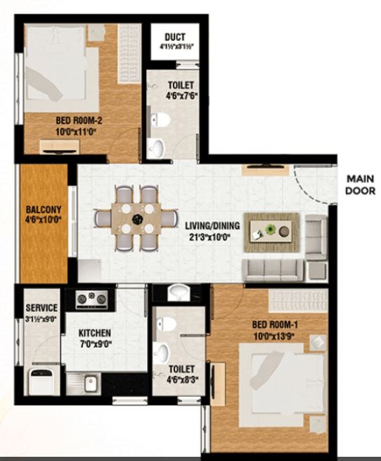 Main Door: Teak wood frame with 35 mm thick panel shutter with Main door locks.