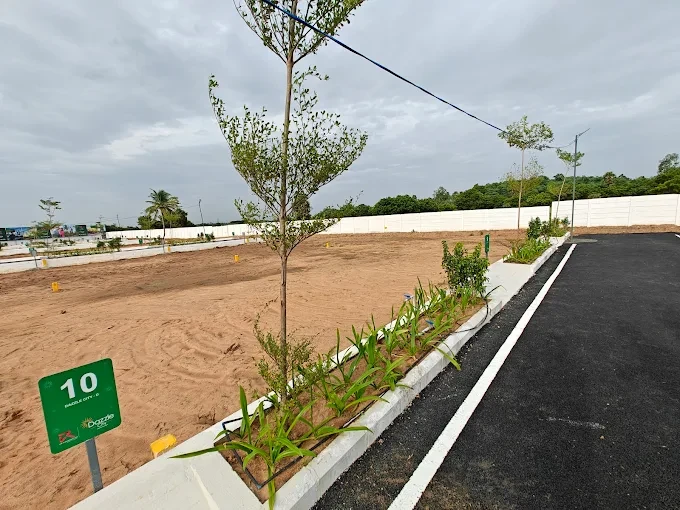 VR Dazzle City is a 25-acre DTCP & RERA-approved gated community in Thirumazhisai, Chennai, offering plots from 800 to 2,400 sq. ft. Key specifications include internal blacktop roads (30 & 33 feet), over 50 amenities like a clubhouse, swimming pool, and gym, and utilities such as street lighting and rainwater harvesting. The development also features 24/7 security, a sewage treatment plant, and is located approximately 15 minutes from the Poonamallee Metro and Bus Terminus. Project and plot specifications