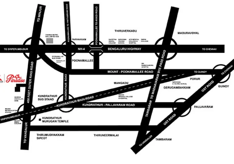 The VR Foundations Paradise project in Poonamallee, Chennai, offers premium plots and villas with the following specifications:Plot Sizes: Ranges from 733 to 1066 sqft. Price Range: Between 23.44 L - 34.2 L. Total Area: The project spans across 1 acre of land. Location: Near the upcoming Poonamallee metro station, with good connectivity to various amenities. Amenities: Includes a mini-clinic, physiotherapy room, and 24/7 ambulance service.