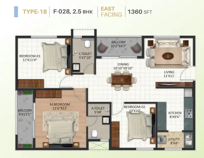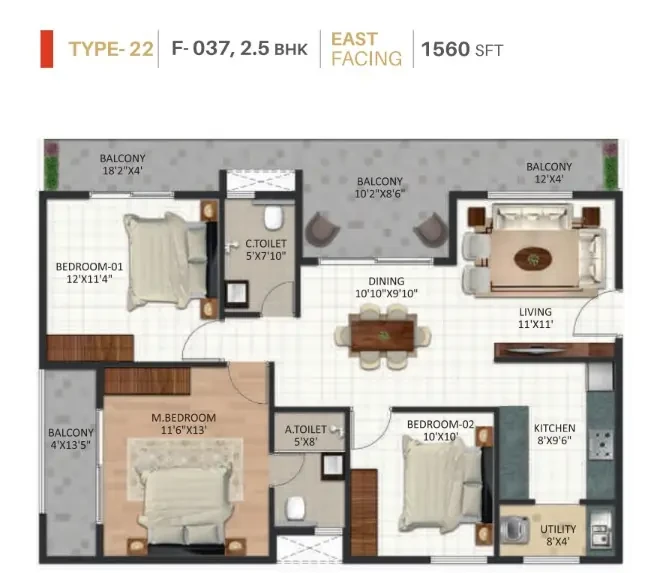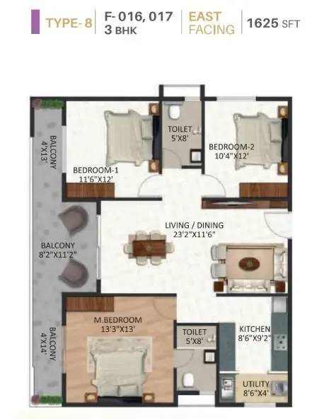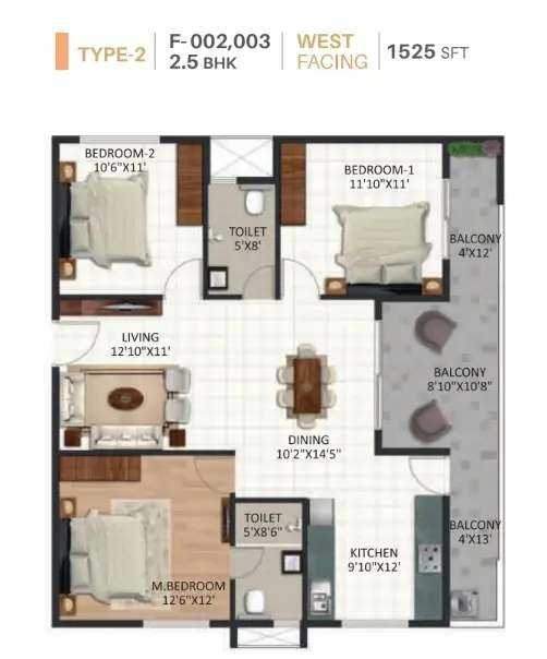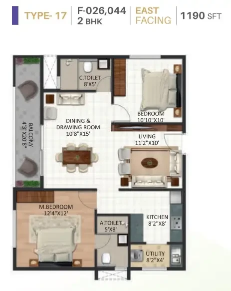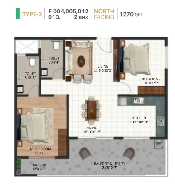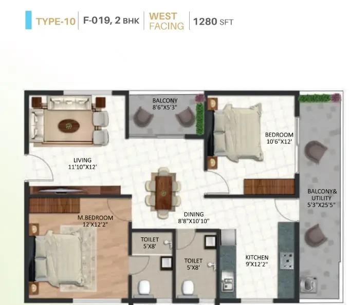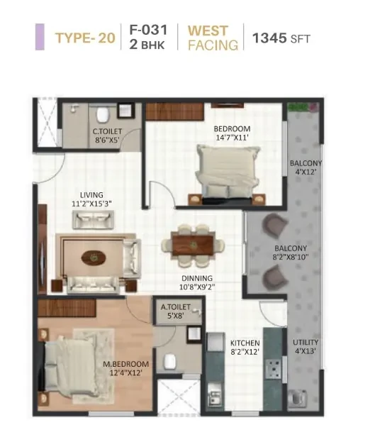 STRUCTURE • RCC Framed Structure designed ISI Code using M25 grade concrete. WALL • External walls - 6" Solid blocks, Internal walls - 4" Solid blocks, Independent walls for all flats. FLOORING • Vitrified tiles for living, dining, kitchen & bedrooms with 4" skirting, Anti-skid ceramic tiles for utility, toilets and balcony, Lift lobby, common area and staircases: Granite flooring. DADOING • Kitchen and toilet dado: Ceramic tiles. PAINTING • Interior walls: One coat of primer & two coats of Tractor emulsion paint with smooth finish, • Exterior Walls: One coat of primer & two coats of Weather proof cement paint. • Main door: Teak polish & Other doors enamel paint. DOORS & WINDOW • Main door: Engineering wood frame with OST shutters. • Internal door: Engineering wood frame with ready made